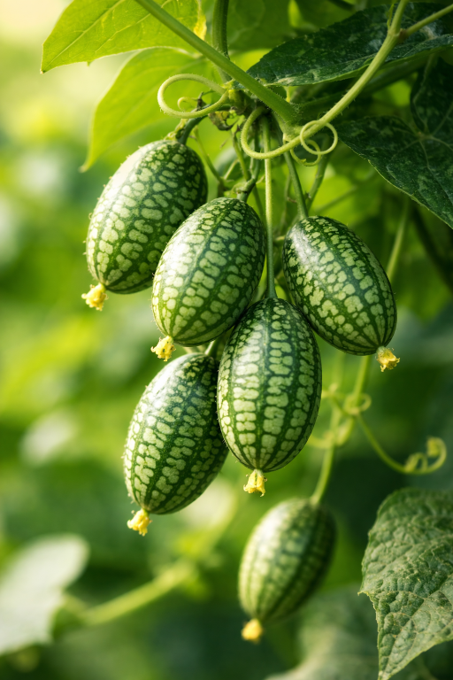 Le cornichon mexicain aigre — aussi appelé cucamelon, melon-souris, sandita (petite pastèque en espagnol) ou pepquino — n'est pas un concombre. Il appartient au genre Melothria, ce qui en fait un parent éloigné des concombres plutôt qu'un membre direct de la famille Cucumis sativus.